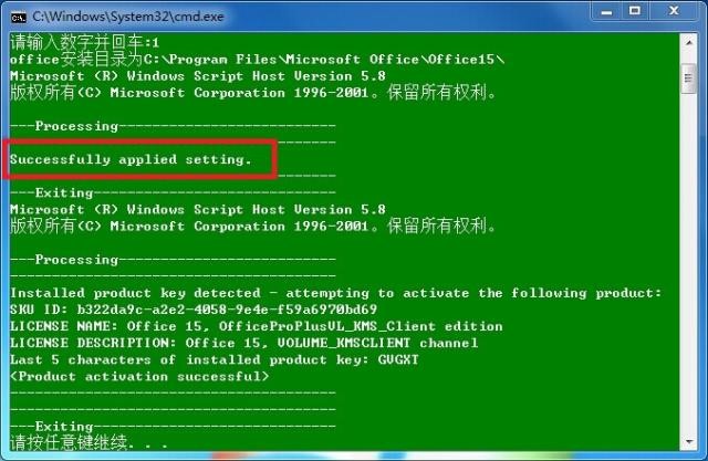 3.激活成功后,界面显示“Successfully applied setting”,根据提示按任意键后激活完成,如图: